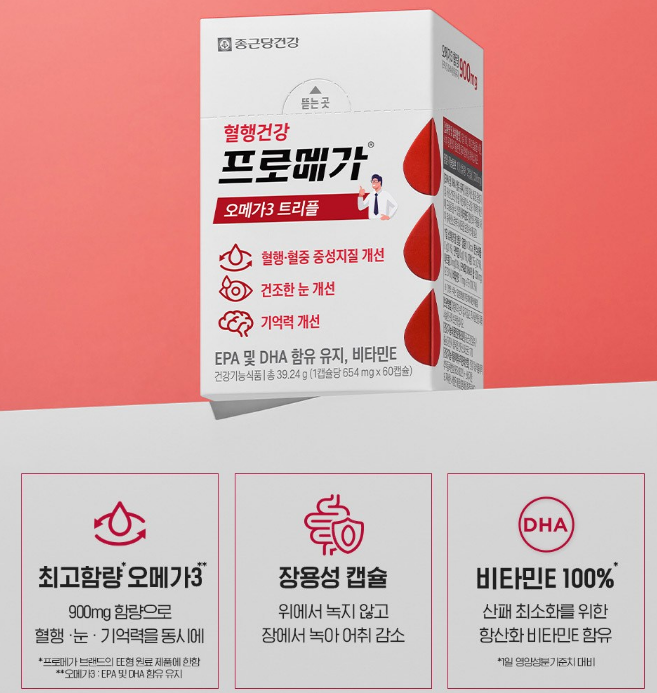 종근당건강 프로메가 오메가3 트리플은 이름에 "트리플"이 들어간 것처럼 혈행·눈·기억력 세 가지를 동시에 커버하겠다는 설계예요. EPA·DHA를 하루 900mg 넣고, 거기에 장용성 캡슐 + 개별 포장까지 얹어서 "함량도 챙기고 비린내 문제도 해결하겠다"는 포지션이에요.